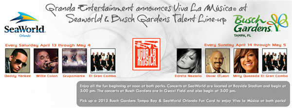 Join the fiesta at SeaWorld Orlando every Saturday, April 13 through May 4; and Busch Gardens Tampa Bay every Sunday, April 14 through May 5, during Viva La Música® 2013, Central Florida's can't-miss Latin food and concert festival. Viva La Música® blends live performances from award-winning Latin artists with popular, regional Latin cuisine and authentic arts and crafts.